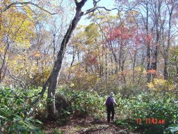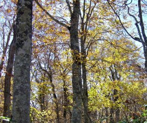 国道403号線を走ると、木島平村糠塚地区に「カヤノ平高原」の大きな看板がある。 カヤノ平が近づくと目の覚めるような紅葉が車窓にとびこんで来る。看板から林道を12キロ、20数分でカヤノ平に着く。 カヤノ平は非常に広々とした空間で、実に気持ち良いところだ。案内所やロッジ、キャンプ場などがある。ここから北へ向かえば八剣山、南へ向かえば高標山へ登ることができる。 どちらにするか迷ったが、八剣山のブナの森を楽しみながら登ることにする。 昨年の晩秋,高標山と八剣山を同時に登ったが紅葉には遅過ぎた。 東コースから登山道へ入ると、すぐにブナの森となる。巨木は少ないが、ブナ純林という感じで、その間には落葉潅木が茂っている。ブナは黄色系、潅木は赤、橙、紅、黄色とまさに色の氾濫を思わせる賑やかさだ。 何回も足を止めながら紅葉・黄葉を愛でながらのんびりと行く。梢の先には吸いこまれそうな紺碧の空が広がり、一点の雲も見えない。 西コースとの分岐で北ドブ湿原へのコースを取る。少し下って行くとキツネ色に枯れた湿原に出る。木道で横断して四阿屋で小休止しながら景色を楽しむ。落葉したカンバの白い幹が陽の光を反射して眩しい。