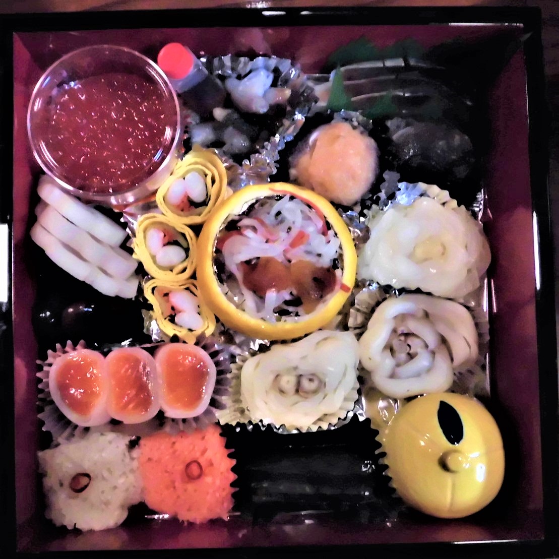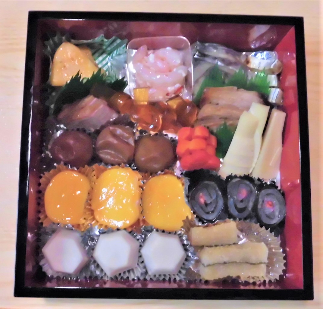 一乃重 鮑土佐蒸し 車海老 数の子 鰊昆布巻き 黒豆 慈姑 袱紗玉子
