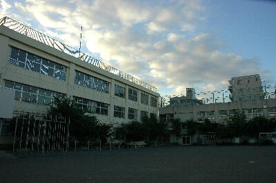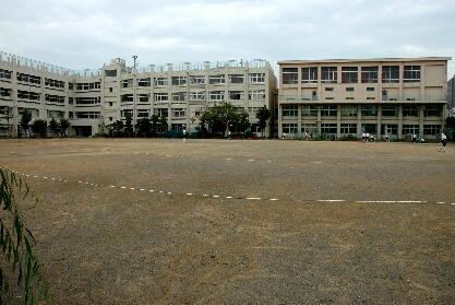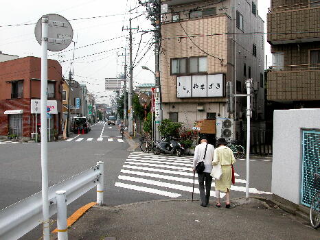 | 前の写真の女の子が走っている場所から右に曲がった踏み切りから撮影、300mぐらい行くと矢口東小学校、道路の突き当たりの三角の屋根が学校(平成17年9月25日の学校)