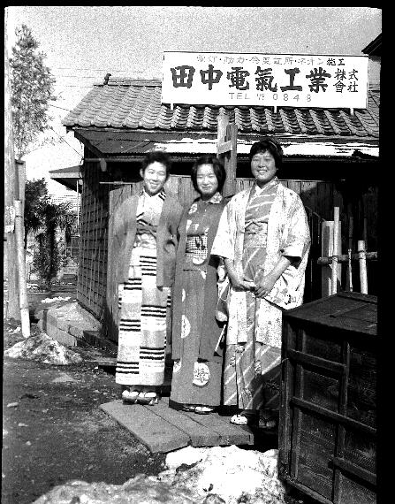 | | お正月に妹と友達の晴れ着姿。手前の黒い箱はゴミ箱です。田中電気工業のあった場所が後ろに下がり年配者が歩いている所で写しています。竹のお飾りが左に見える、白っぽいのが雪です。と言う事は40年ぐらい前は正月に雪が降ったのですネ。 |