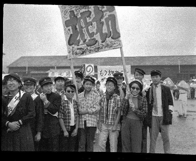 | | 3年D組の仮装行列で、あの時代流行した風俗、社会風刺をプラカ-ド作りで入賞したと思うのだがあの頃は、主婦連、抵抗族、40歳の抵抗、風呂代値上げ反対(石川五右衛門)なんて書いたプラカ-ドで練り歩いた。後ろの校舎を見てください今はどこにも無い。女性は男性、男性は女性の仮装しました。 |