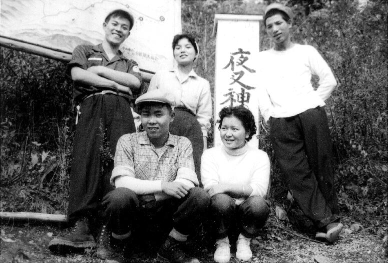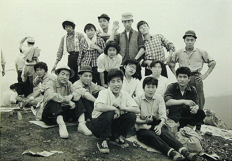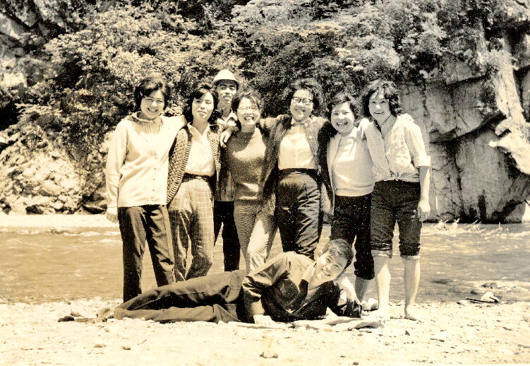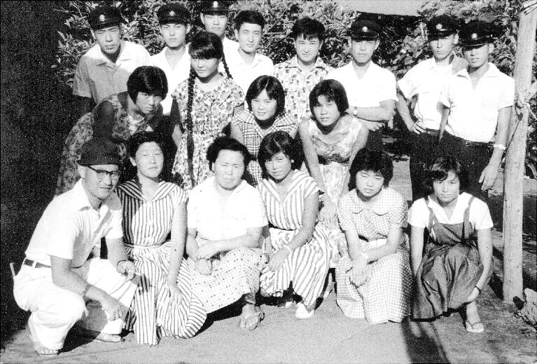 | 「禁煙」の貼り紙の横の3人は渋谷さん、金子さん、下を向いている方は? 胸の名前が田中さん、1人飛んで小野沢さん、国分さん、飯沼さん、坊主頭の影が撮影中の私です。 「パンツ」の年から6年でこんなに変わったのかチョツト不思議です。 (47年前の写真としては上手くフイルムから仕上がりました) |