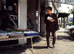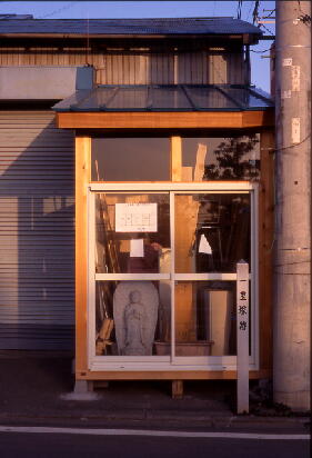 | 2002年 4月号 アサヒカメラ ファ-ストステップ部門 次点 CONTAX-TVS 自宅から10分ぐらいの建築材店。電柱の所が一里塚跡ですがお地蔵さんはお店のものです(店の方に一里塚があるので大切にしているように思えて聞いたところ商品でした) |