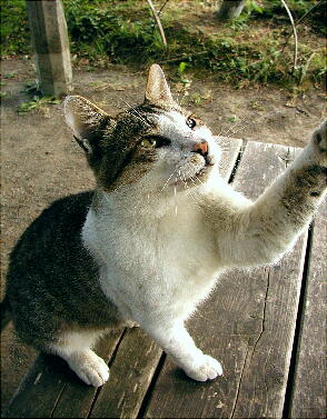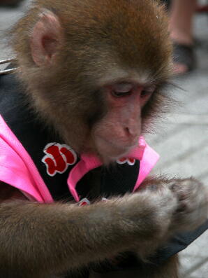 | 1次予選通過 アサヒカメラ ファ−ストステップ部門 H16.1月号の応募作品 名前のみ掲載。 このお猿さんは有楽町数寄屋橋跡の小さな広場で大道芸で披露していました。お猿さんの芸達者を見せた後でご祝儀を観客から戴いている間のスナップです。私もお猿さんに50センチ位まで近づいて写しました。ただしご祝儀はモデル代として1000円だしました。『働けど働けど吾が暮らし、楽にならずジット吾が手を見つめる』 |