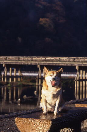 | ニコン F5 24〜120mm F5.6 AE PROVIA 100F。 京都嵐山で渡月橋をバックに嵐山に霜が降りた朝・朝陽を受けて 気持ちの良い散歩をした。 |
