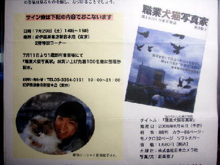 | 新宿東口は蒸し暑い午後「新宿エイサーまつり」の人出で紀伊国屋書店まで 人波を泳いで行きました、 一階で「職業犬猫写真家」写真集を購入し整理券を受け取り時間が早いので 表に出て「エイサー」を見学しサイン会場に戻ったら並び始めていました。 |